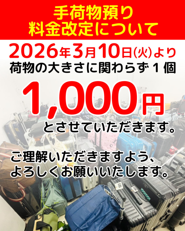 手荷物預かり料金改定について 投稿日:2026.02.28 更新日:2026.02.28 2026年3月10日(火)より、荷物の大きさに関わらず1個1,000円とさせていただきます。 ご理解いただきますよう、お願いいたします。 前へ